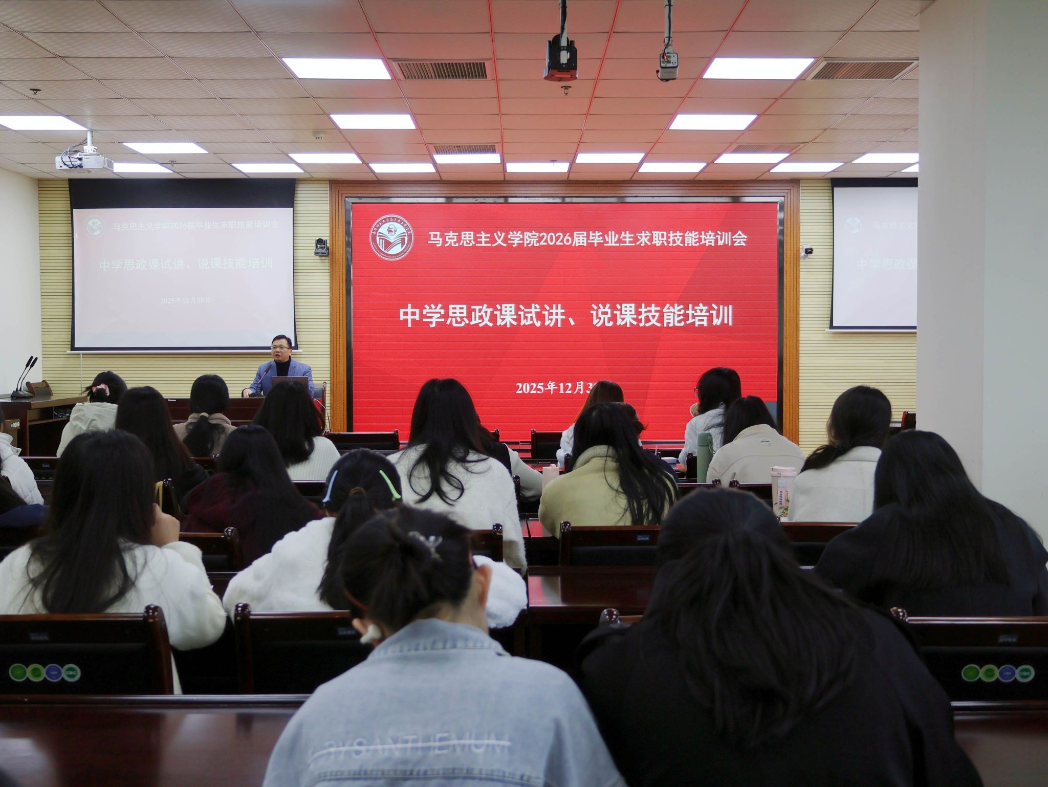 为提升2026届毕业生求职竞争力,帮助学子掌握中学思政课试讲、说课核心技能,我院于12月30日上午在五合校区8栋B座215学术报告厅举办了2026届毕业生求职技能培训会。学院党委副书记黄志海、辅导员王玉香及2026届毕业生参加本次活动。