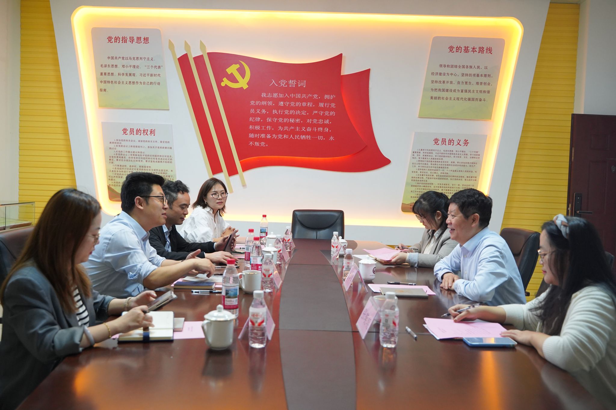 随后,双方在五合校区8B212党员活动室举行专题交流座谈会。会上,曾令辉院长代表学院对吴文杰书记一行的到来表示热烈欢迎,介绍了我院的建设发展概况。双方围绕马克思主义理论学科专业建设、辅导员队伍专业化建设、人才培养模式创新等核心工作,进行了深入探讨和细致交流,重点就学科建设对标提升、破解发展瓶颈、打造可复制可推广的工作模式等方面深入研讨、凝聚共识。西南大学马克思主义学院一行毫无保留地分享了其在学科建设、办学治院等方面的先进经验——该校正在推进马克思主义理论学科一流学科培育,在学科发展规划、人才梯队构建、科研平台升级等方面成效显著,为我院学科建设提供了宝贵借鉴。吴文杰对我院的精心安排和经验分享表示衷心感谢,并希望两院进一步深化常态化交流合作,互学互鉴、优势互补,共同推动马克思主义学院高质量发展。