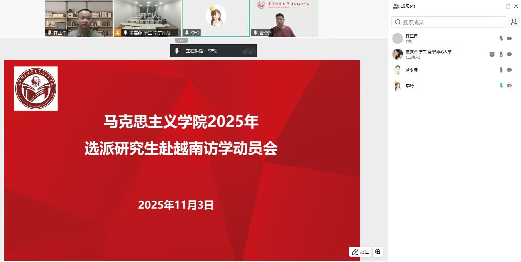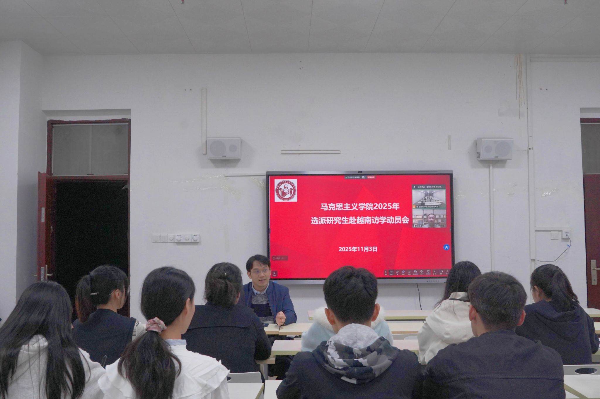 我院于11月3日晚召开2025年选派研究生赴越南访学动员会,李玲书记、曾令辉院长、许正伟博士为选派的研究生作临行前的注意事项提醒,本次动员会由邱尹副院长主持。